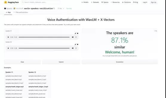 由于在 Speaker Verification 任务上极好的表现,Hugging Face 使用 WavLM 作为种子进行 finetuning,制作了一个在线 Demo,检测两段语音是否来自同一说话人。