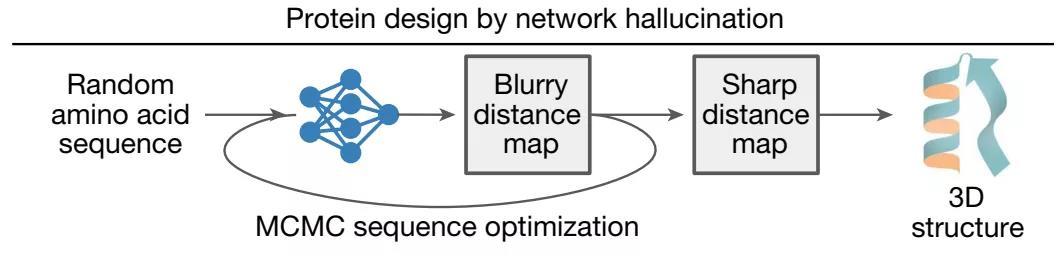 David Baker之前的工作trRosetta已经可以做到根据氨基酸序列精准地预测其结构,在此基础上,如果输入到trRosetta中的序列本身是具有我们需要的蛋白特征的,那么最后折叠出来的蛋白也将具有理想特征。而现在关键的问题是:如何使序列本身具有理想特征呢?DeepDream带给了David Baker灵感,如果能够像DeepDream一样,训练过程中不断“强化”随机氨基酸序列的理想特征,那么最后就将生成具有理想特征的“想象蛋白”。