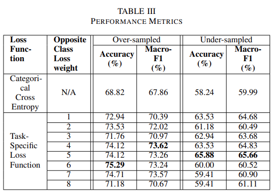 相比之下,欠采样方法减少了 3 个数量较多的类的样本,以匹配样本数量最少的类。使用这两种组合的数据集来训练分类模型,首先使用分类交叉熵损失训练,然后使用任务特定损失函数训练。团队实验了相反的类减重超参数,指标比较如表三所示。