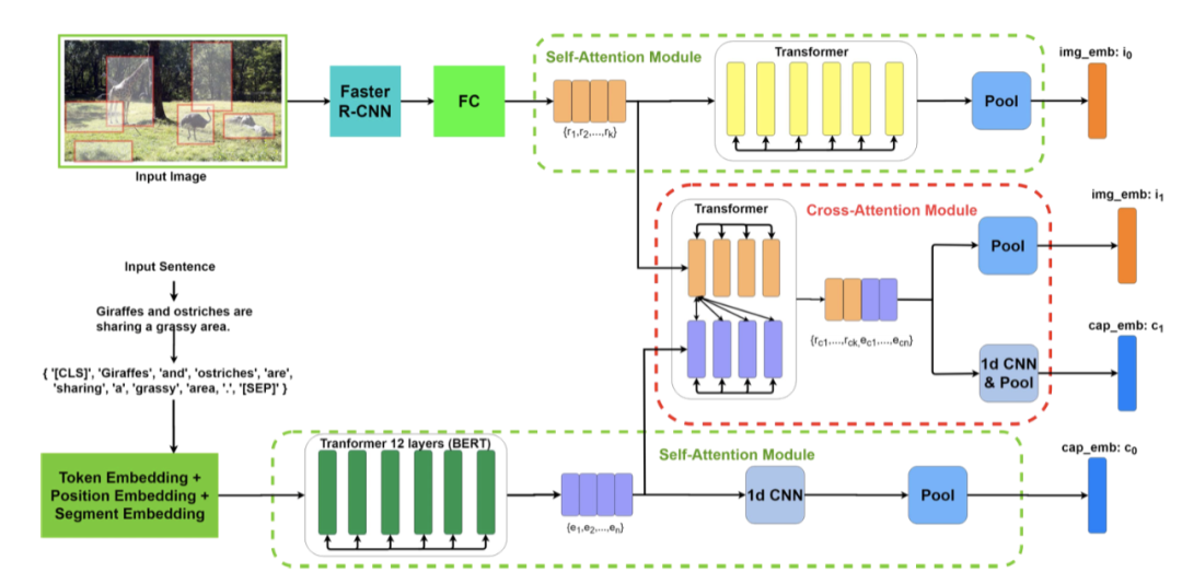 如上图所示,本文的多模态交叉注意网络主要由两个模块组成,即自注意模块 和交叉注意模块,分别在图中的绿色虚线块和红色虚线块中进行了展示。