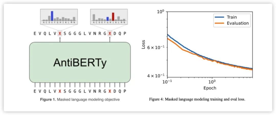 为了学习到抗体的表征,AntiBERTy采用了BERT构架,其中隐藏层维度为512,feedforward层为2048维,共计8层,每层8头注意力。共计约26M的参数量。以OAS数据库中约5.58亿条(95% training,5% testing)的自然抗体序列作为训练集,采用Mask Language Model的方式进行训练。共计训练8个epochs。