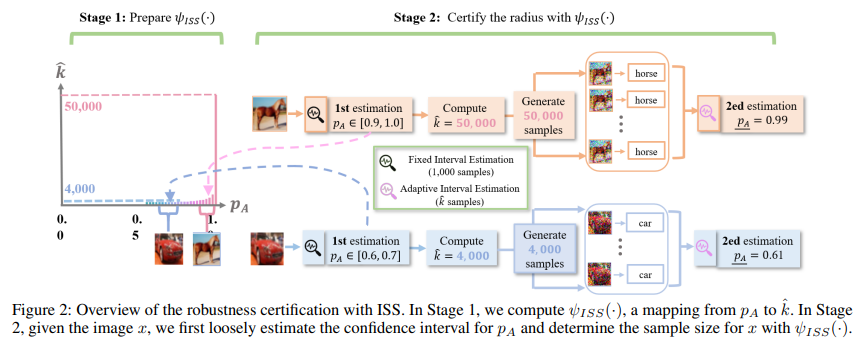 现在问题在于,对于每个输入我如何确定该选用多大的采样数。我们这里给出了一种方案:先预设一个理想的采样数 (这个数一般很大,例如1000,000),我们将在采样数下得到的当作理想半径,而我们希望求出最小的采样数使得我们在该采样数下认证半径与理想半径的差小于等于一个定值,这个定值我们表示为。实际上,这个最小采样数只与有关(当与给定),于是我们就可以提前计算出一个函数,输入就能得到。具体的ISS认证过程如下图: