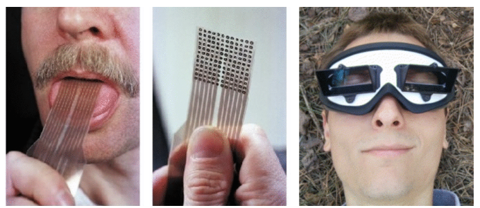 左图:舌显象装置(Maris 和 Bach-y-Rita,2001;图片:Kaczmarek,2011);右图:“倒置眼镜”,最初由 Erismann 和 Kohler 构思于 1931 年。(图片:维基百科 Upside down goggles)