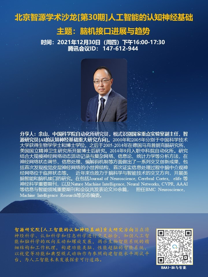 【主讲人】分享人:余山,中国科学院自动化所研究员,模式识别国家重点实验室副主任,智源研究员[AI的认知神经基础重大研究方向]。2000年和2005年分别于中国科学技术大学获得生物学学士和博士学位。之后于2005-2014年在德国马克普朗克脑研究所、美国国立精神卫生研究所开展博士后研究。2014年9月入职中科院自动化所。研究结合大规模神经网络动态活动记录与复杂网络、信息论、统计力学等分析方法,在神经网络状态调节、信息处理、编解码机制等方面做出了一系列交叉创新成果,包括首次发现视觉皮层神经网络的小世界结构、首次证实信息处理过程中脑中介观神经网络位于临界状态等。 近年来也致力于脑科学与智能技术的交叉方向,开展类脑智能和脑机接口的研究。在包括Journal of Neuroscience, Cerebral Cortex, elife 等神经科学重要期刊,以及Nature Machine Intelligence, Neural Networks, CVPR, AAAI等信息与智能领域重要期刊和会议共发表论文30余篇, 担任BMC Neuroscience, Machine Intelligence Research等杂志编委