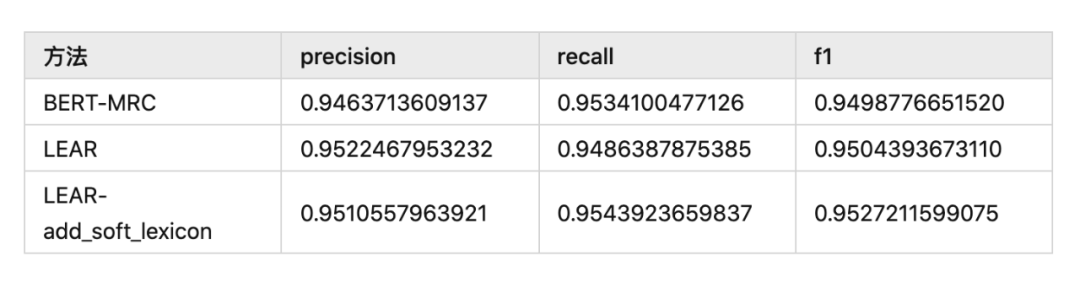 可以看到增加了词汇增强信息后,LEAR 的效果有一定的提升。如果对这个方法感兴趣,可以尝试实现完整功能的增强,让增强信息也参与到模型学习中,最后应该会有很大的提升。