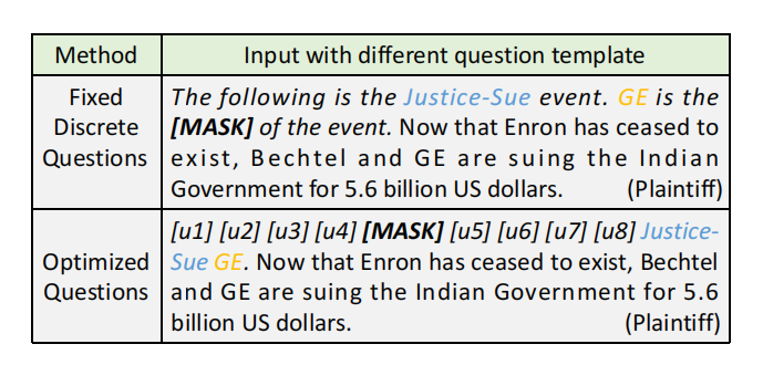 如图1所示,我们将一个问题与输入的句子连接起来,并利用[MASK]来指示后续预测的事件类型。从而事件参数提取作为一种基于问题模板的完形填空任务,以掩码语言建模的方式进行。在第二个优化模板的例子中,我们使用伪问题令牌来搜索最可能的事件参数角色类型。