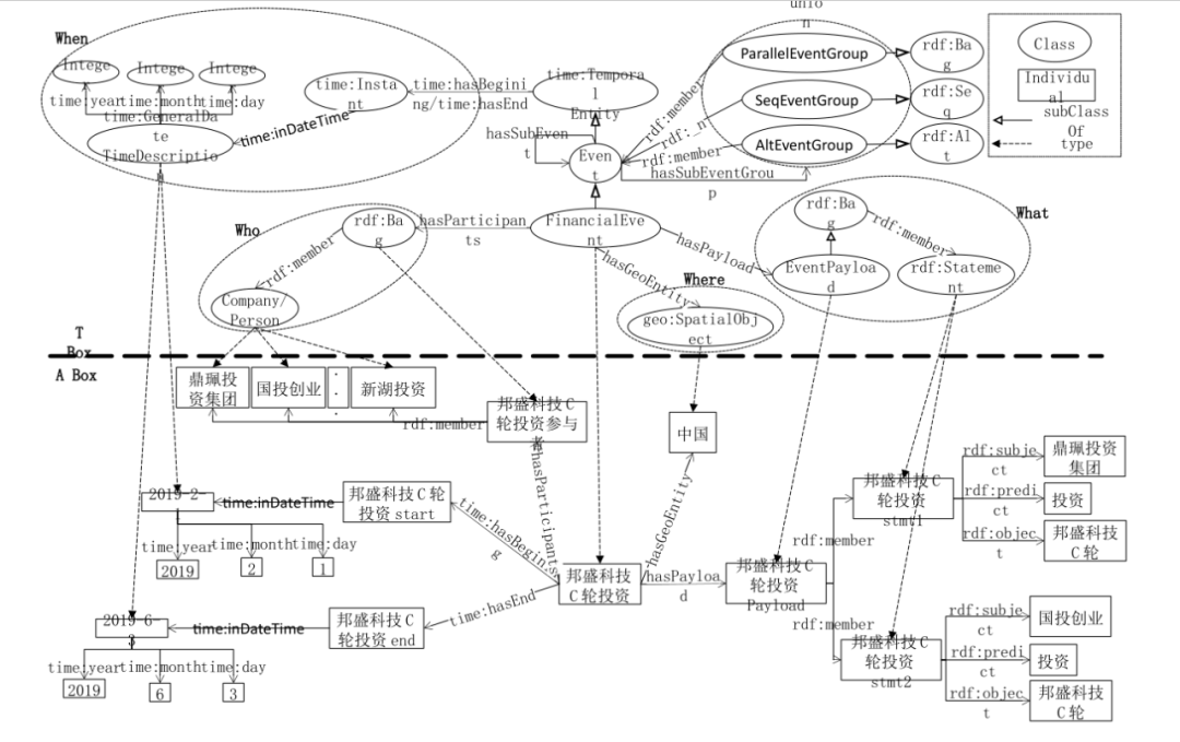 在此开放资源中,面对金融领域多元关系表示的困境和时序事件表示需求,我们以OWL语义为基础,结合金融领域专业知识,融合超图概念和事件5W(When,where,Why,What,WHo)定义构建了可通用化的金融时序超图本体模型(Finanical Temporal Hypergraph Ontology,FTHO)。