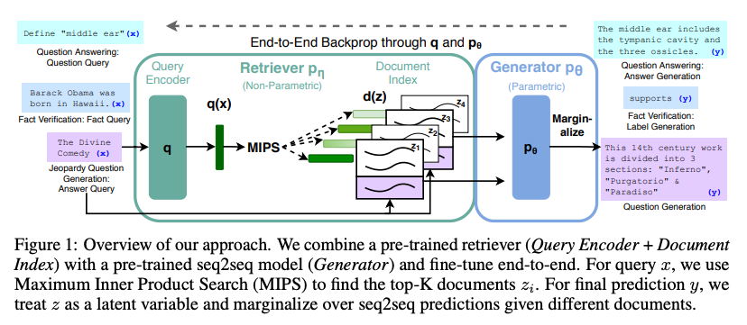 典型的方法包括基于邻域搜索的语言模型(kNN-LM),基于邻域搜索的机器翻译(kNN-MT),以及使用搜索的语言生成。如 RAG ([7],见上图)和 MARGE([8],2020 年)使用搜索 + 释义进行预训练学习。