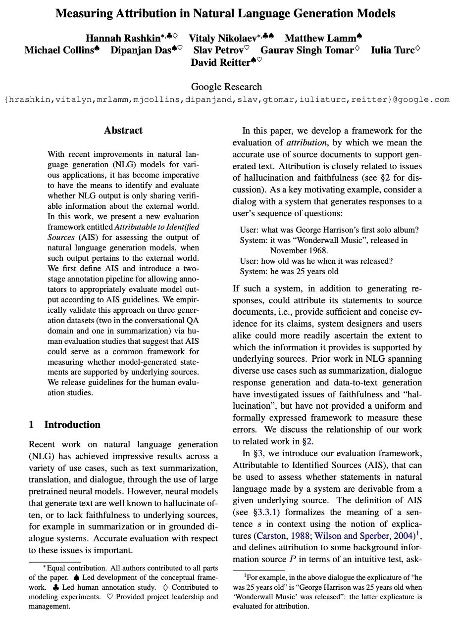 自然语言生成模型的归因性度量。随着最近自然语言生成(NLG)模型在各种应用中的改进,必须要有办法来识别和评估NLG输出是否只是分享关于外部世界的可验证信息。本文提出一种新的评估框架,"识别源可归因性(AIS)",用于当输出与外部世界有关时对自然语言生成模型输出进行评估。首先定义了AIS,介绍了一个两阶段的标注管线,允许标注者根据AIS指南适当地评估模型输出。通过人工评价研究在三个生成数据集(两个是对话QA领域,一个是摘要领域)上对这个方法进行了实证验证,表明AIS可以作为衡量模型生成语句是否有基本来源支持的通用框架。