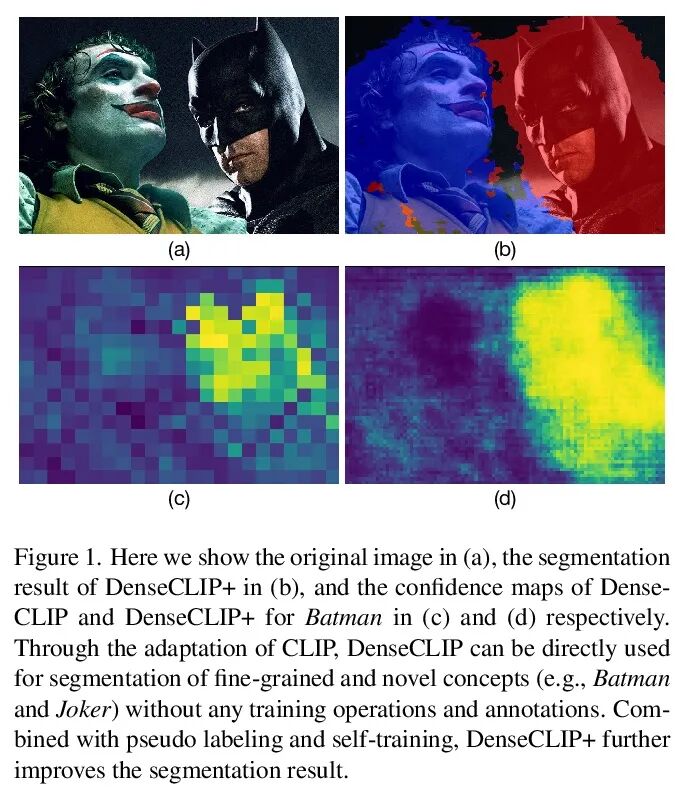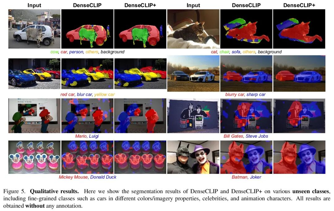 DenseCLIP:CLIP稠密标记提取。对比语言-图像预训练(CLIP)在开放词表的零样本图像识别方面取得了显著突破。许多最近的研究利用预训练的CLIP模型进行图像级的分类和操纵。本文进一步探索CLIP在像素级稠密预测方面的潜力,特别是在语义分割方面。所提出的方法DenseCLIP,在没有标注和微调的情况下,对各种数据集的开放概念产生了合理的分割结果。通过添加伪标记和自训练,DenseCLIP+以很大幅度超过了SOTA的归纳式零样本语义分割方法,例如,PASCAL VOC/PASCAL Context/COCO Stuff上的未见类的mIoU从35.6/20.7/30.3提高到86.1/66.7/54.7。测试了DenseCLIP在输入损坏情况下的鲁棒性,并评估了它对细粒度目标和新概念的分辨能力。实验表明,DenseCLIP可以作为稠密预测任务的一个新的可靠的监督来源,以实现免标注的分割。