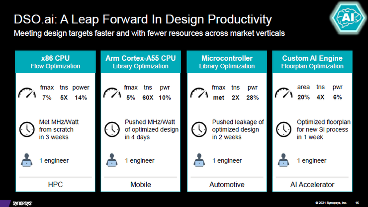 以新思科技的DSO.ai为例,美国 头部IDM厂商采用DSO.ai后成果显著,芯片设计的时间提升2-5倍,SoC芯片能耗整体提升9%。将DSO.ai应用于不同类型芯片的设计流程,仅需一位工程师就能带来显著的时间节省和性能提升。