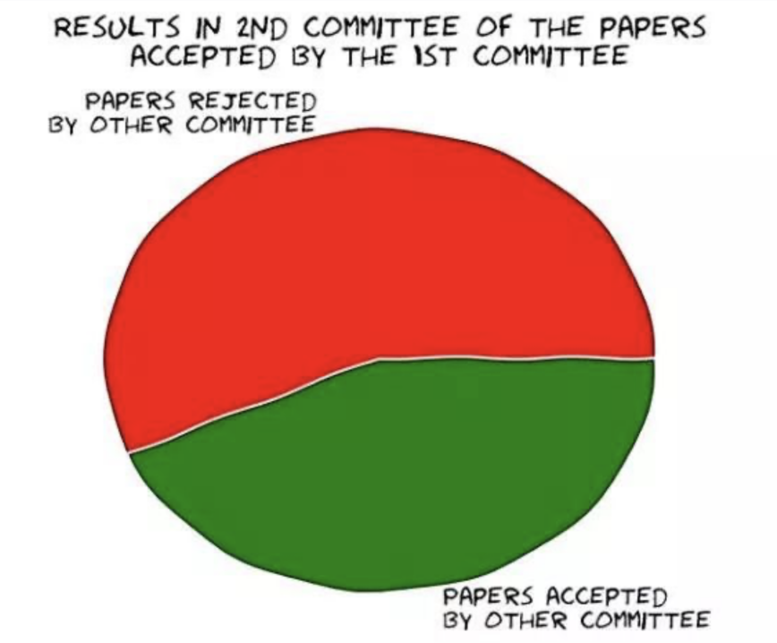 例如,在2014年著名的NeurIPS实验中,人们观察到评审分数具有惊人的高度随意性。从理论上讲,如果重新审稿,NeurIPS 2014年录用的一半以上的文章将被拒稿!