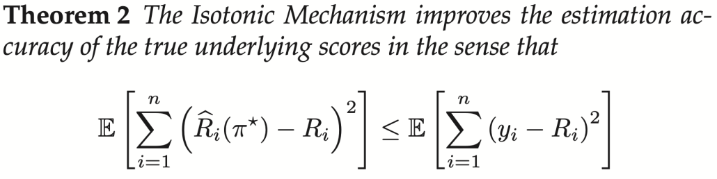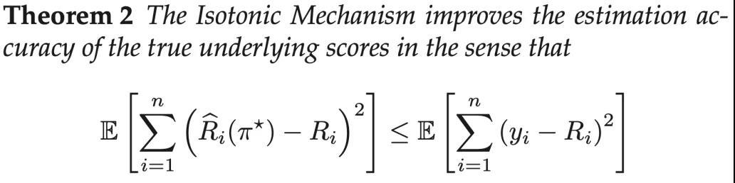 那么,机制要求投稿人汇报自己对这n篇论文打分的排序π,再结合审稿人给出的原始平均分数y1, y2, …, yn,解一个凸问题并给出最终分数。