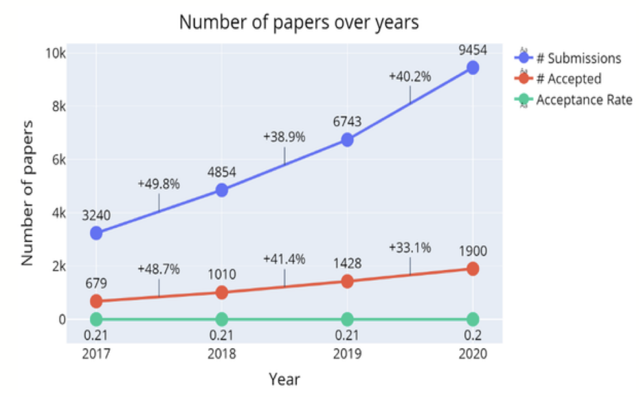 正所谓「成也萧何,败也萧何」,同行评审本应是高质量、高影响力研究的过滤器。然而,随着近年来人工智能和机器学习会议大火,投稿数量激增,同行评审制度似乎有一点变味了。