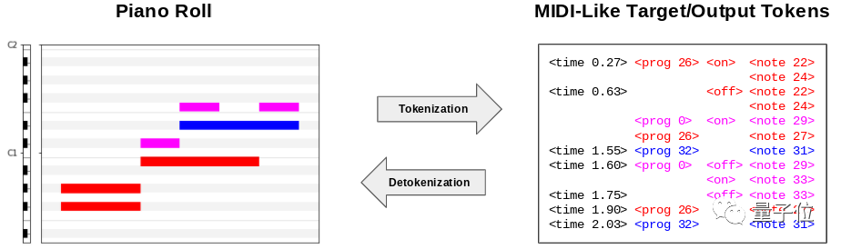 MT3使用梅尔频谱图作为输入。对于输出,作者构建了一个受MIDI规范启发的token词汇,称为“类MIDI”。