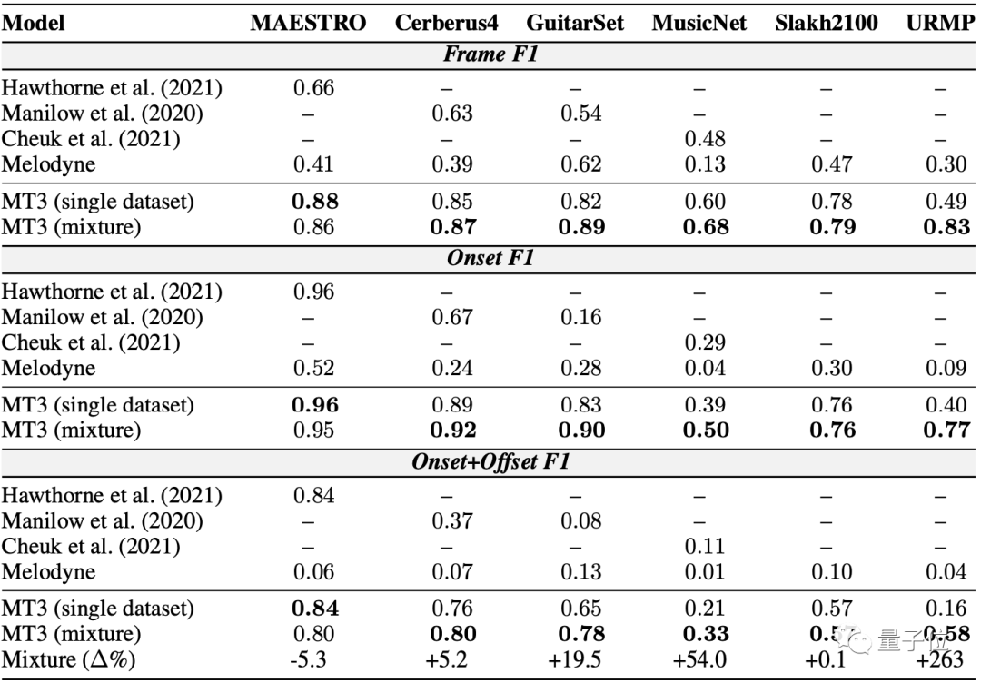 听起来是不是很像原版演奏?事实上,谷歌MT3在还原多音轨乐谱这件事上,达到了SOTA的结果。