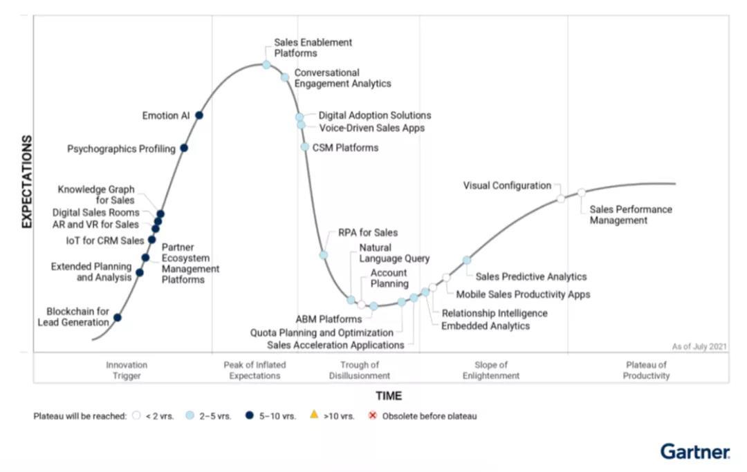 图注:Gartner的销售科技(SalesTech)技术成熟度曲线2021显示,销售赋能一支已经渡过「技术萌芽期」(Innovation Trigger),进入「期望膨胀区」(Peak of Inflated Expectations)