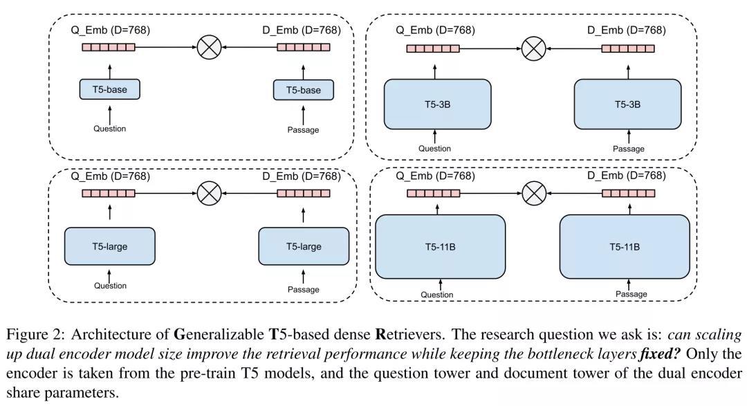 为了回答这个问题,作者在固定稠密向量维度()不变的条件下,采用不同尺寸的T5-encoder(base、large、3B、11B)训练稠密检索模型。实验结果表明,「稠密检索模型的瓶颈并不完全在于单个向量的表示能力不足,编码器的能力也会在很大程度上影响模型的泛化能力。」
