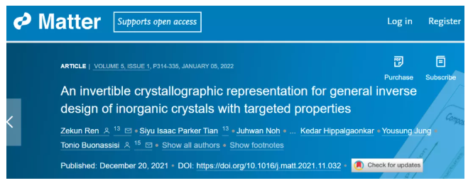 这一突破于 2022 年 1 月 5 日以「An invertible crystallographic representation for general inverse design of inorganic crystals with targeted properties」(具有目标特性的无机晶体的一般逆向设计的可逆晶体学表示) 为题发表在《Matter》杂志上。