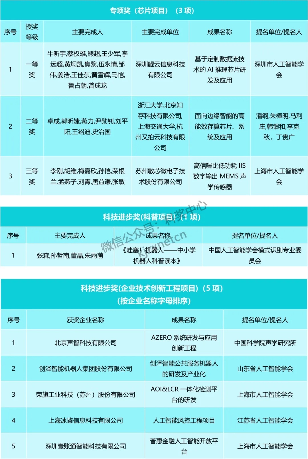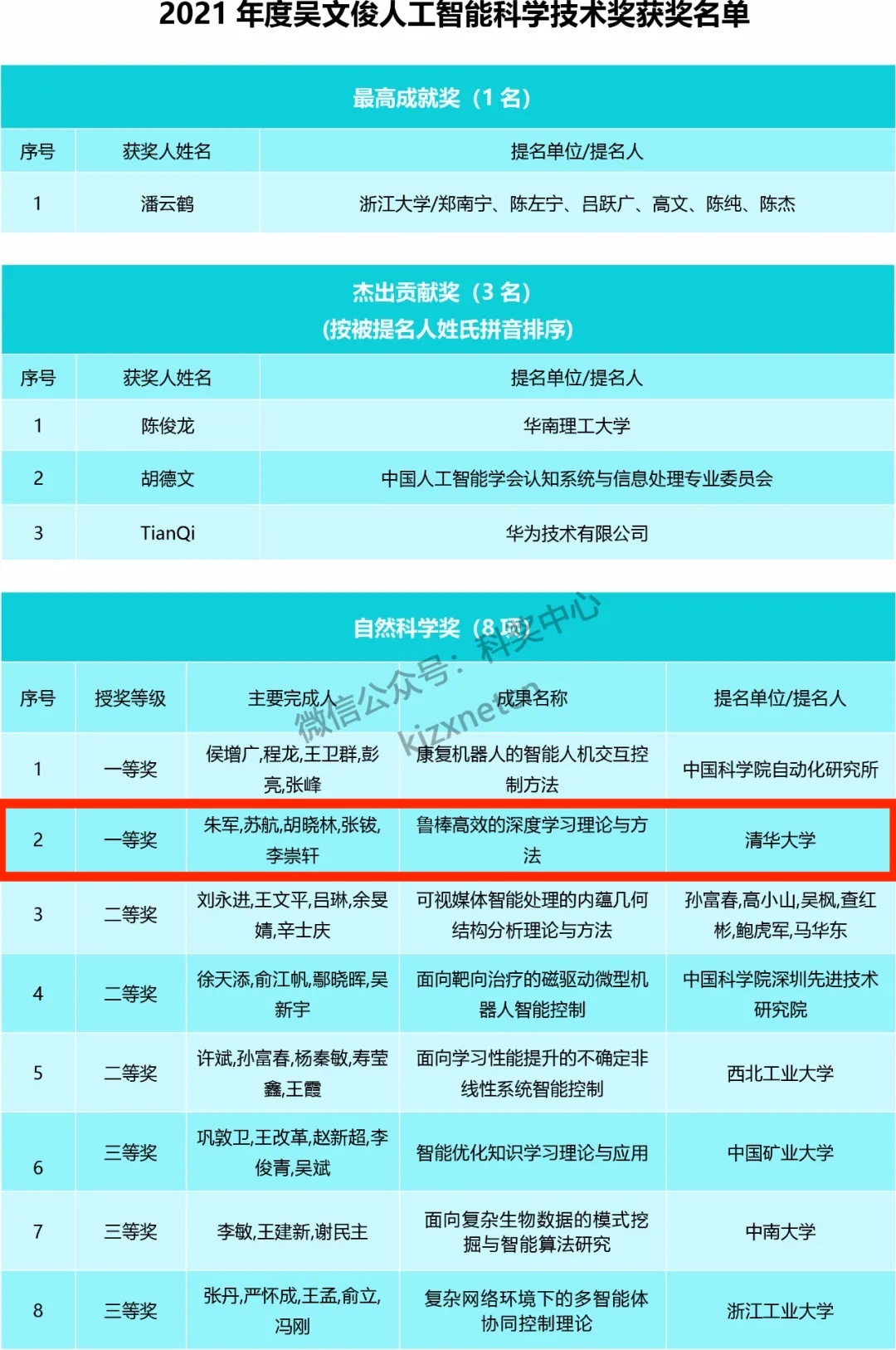 依据《吴文俊人工智能科学技术奖励条例》和《吴文俊人工智能科学技术奖励实施细则》相关规定,中国人工智能学会对提名2021年度吴文俊人工智能科学技术奖的成果,通过形式审查、函评、初评会评和终评会评等环节,经吴文俊人工智能科学技术奖励委员会审核通过,报中国人工智能学会理事长批准,确定了66项成果为2021年度吴文俊人工智能科学技术奖拟授奖项目,现进行公示。自公示之日起10日内(1月17日至1月26日)。