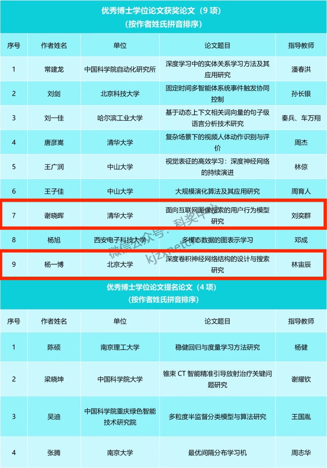 智源学者、清华大学教授刘奕群指导的谢晓晖“面向互联网图像搜索的用户行为模型研究”,智源学者、北京大学教授林宙辰指导的杨一博“深度卷积神经网络结构的设计与搜索研究”获得优秀博士学位论文奖。