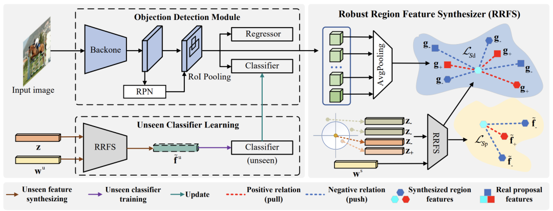 在这项研究中,研究者揭示了该研究领域的核心挑战:如何合成与真实样本一样具有类内多样性和类间可分性的鲁棒区域特征(对于未见对象),从而可以实现强大的未见目标检测器。