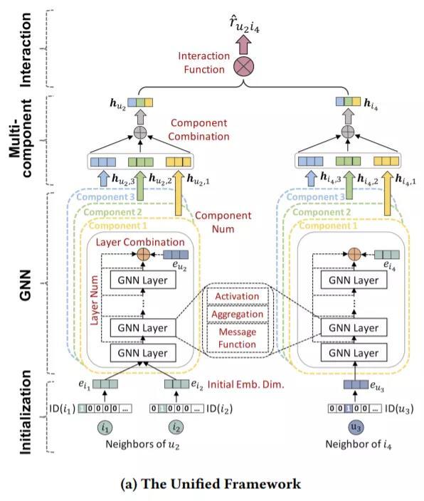 现存的基于GNN的CF通常可以被划分为4个模块:初始化,GNN,多组件和交互。