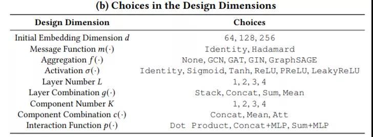 聚合f():考虑四种常见且有效的 GNN 方法作为其设计选择:GCN,GAT,GIN和GraphSAGE。同时包括None的选择,这表示不利用图信息并通过 MLP 细化用户/商品表征,以扩大设计空间的容量以包括那些非基于 GNN 的模型。 -