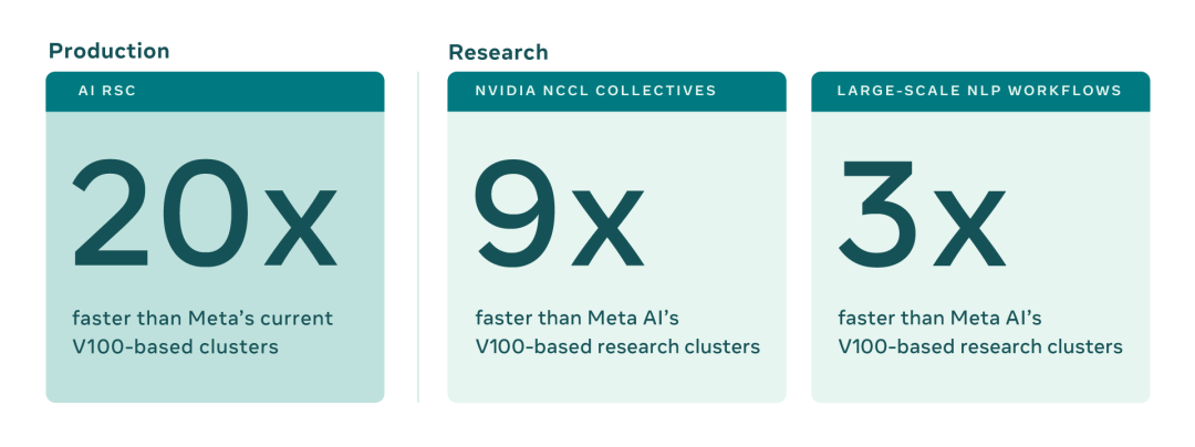 RSC的早期基准测试表明,较于第一代超算,它运行计算机视觉工作流程的速度提高了20倍,运行英伟达集体通信库(NCCL)的速度提高了9倍多,训练大规模NLP模型的速度提高了3倍。