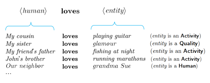 这是一个给潜在无限数量的句子的模板,因为爱的媒介可以是任何人类,而爱的对象可以是任何实体(人类,如玛丽或隔壁的男孩;或像弹吉他这样的活动!)。因此,孩子所学到的是对某一类型/类别的符号进行量化的规则。下面是上述模板的一些实例。