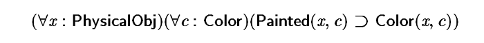 作为另一个简单的例子,孩子也会很快学会把某个椅子,比如说chair1,涂成红色,从而得到Color(chair1, red)这一事实。但是,一旦这个模板被实例化,孩子就不需要看到door2 涂成白色,就知道会产生Color(door2, white);也不需要看到car100涂成黄色,就知道会产生Color(car100, yellow)。孩子学会了对代表概念的更高层次符号的量化概括: