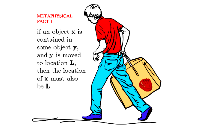 因为他的棒球手套在他的公文包里,所以汤姆知道如果他把公文包放在他母亲的SUV里,他的棒球手套的位置也是他母亲的SUV的位置。他还知道,如果他们开车去纽约的伍德斯托克,那么他的棒球手套现在就在纽约的伍德斯托克,等等。