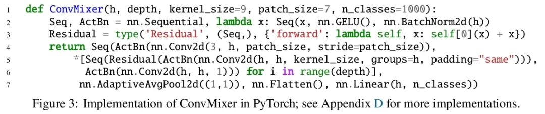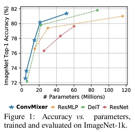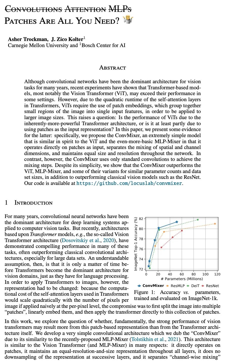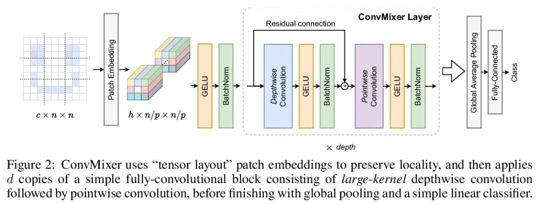 ConvMixers:只用标准卷积结合图块嵌入性能超Transformer的极简模型。尽管多年来卷积网络一直是视觉任务的主流架构,但最近的实验表明,基于Transformer的模型,最值得注意的是视觉Transformer(ViT),在某些情况下可能超过其性能。然而,由于Transformer自注意力层的二次方运行时间,ViT需要使用图块嵌入,将图像的小区域组合成单一的输入特征,以便应用于较大的图像尺寸。这就提出了一个问题。ViT的性能是由于固有的更强大的Transformer架构,还是至少部分是由于使用图块作为输入表示?本文为后者提供了一些证据:提出ConvMixer,一种极其简单的模型,与ViT和更基本的MLP-Mixer的精神相似,直接以图块作为输入,分离了空间和通道维度的混合,并在整个网络中保持了同等的大小和分辨率。ConvMixer只使用标准卷积来实现混合步骤。尽管ConvMixer很简单,但其性能优于ViT、MLP-Mixer和它们的一些变种,在类似的参数量和数据集大小下,也优于经典的视觉模型,如ResNet。