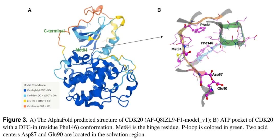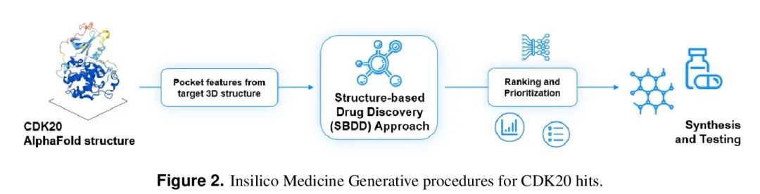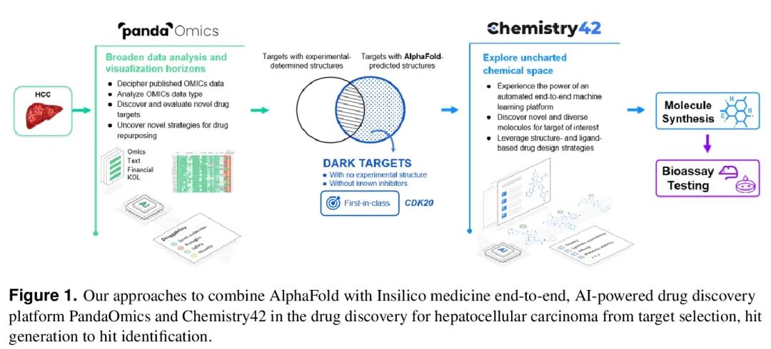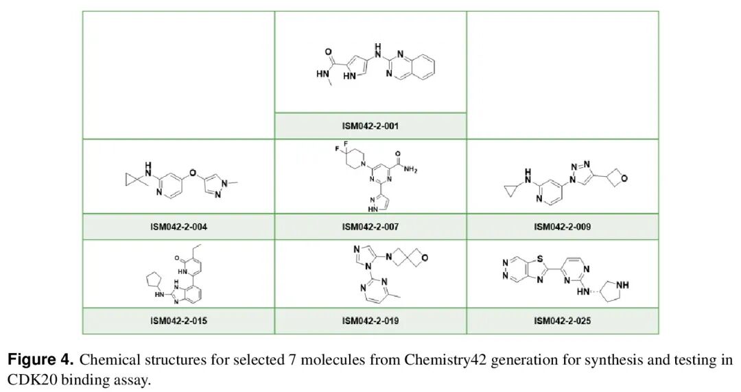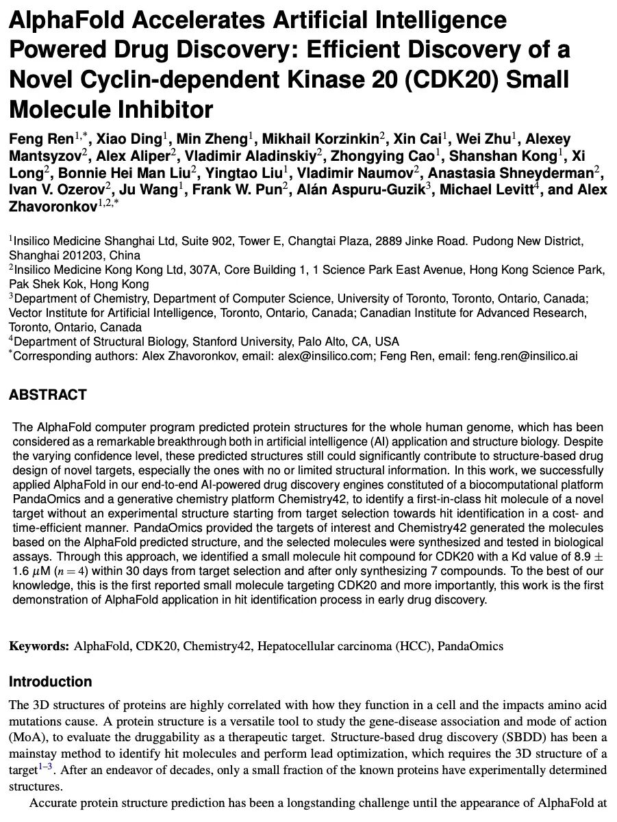 AlphaFold在早期药物发现过程中的应用:新型细胞周期蛋白依赖性激酶20(CDK20)小分子抑制剂高效发现。AlphaFold计算机程序预测了整个人类基因组的蛋白质结构,这被认为是人工智能(AI)应用和结构生物学方面的一个显著突破。尽管置信度不同,这些预测的结构仍然可以大大有助于基于结构的新靶点药物设计,特别是那些没有或有限的结构信息。本文成功地将AlphaFold应用于由生物计算平台PandaOmics和生成化学平台Chemistry42组成的端到端人工智能药物发现引擎中,以一种低成本和高时效的方式,从目标选择到命中识别,确定了没有实验结构的新型目标的首创新药命中分子。PandaOmics提供感兴趣目标,Chemistry42根据AlphaFold预测的结构生成分子,被选中的分子被合成并在生物实验中测试。通过这种方法,在选择目标后的30天内,只合成了7个化合物,就发现了CDK20小分子命中化合物,Kd值为8.9±1.6μM(n=4)。据我们所知,这是第一个发布的针对CDK20的小分子化合物,更重要的是,这项工作是AlphaFold在早期药物发现过程中应用的首次展示。
