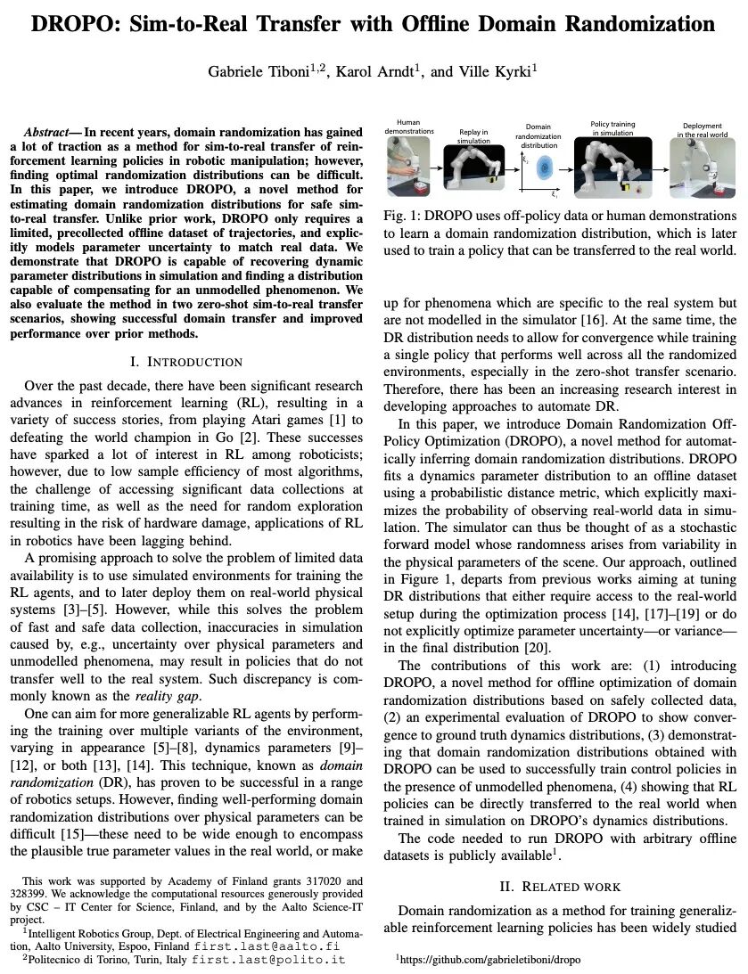 DROPO:基于离线域随机化的Sim-to-Real迁移