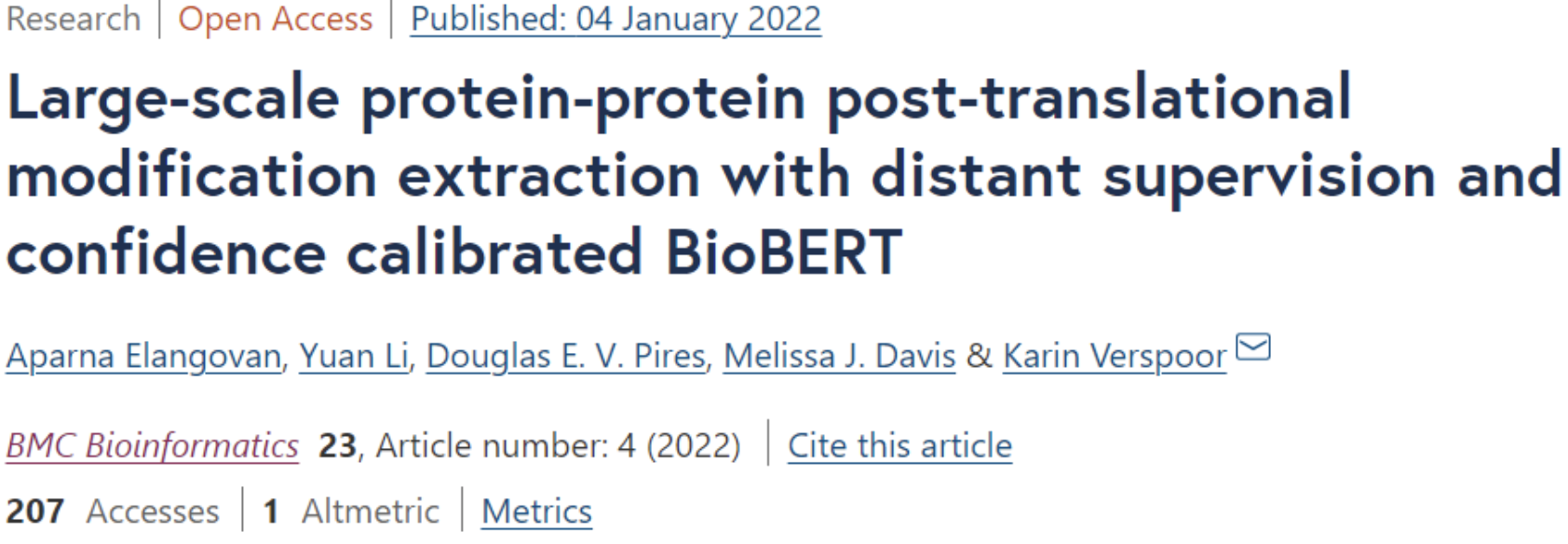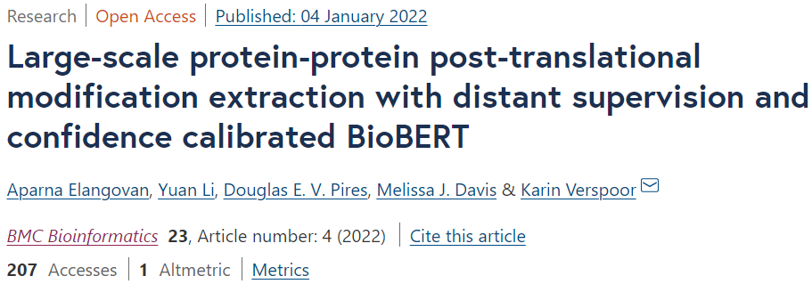 该研究以「Large-scale protein-protein post-translational modification extraction with distant supervision and confidence calibrated BioBERT」为题,于 2022 年 1 月 4 日发布在《BMC Bioinformatics》。