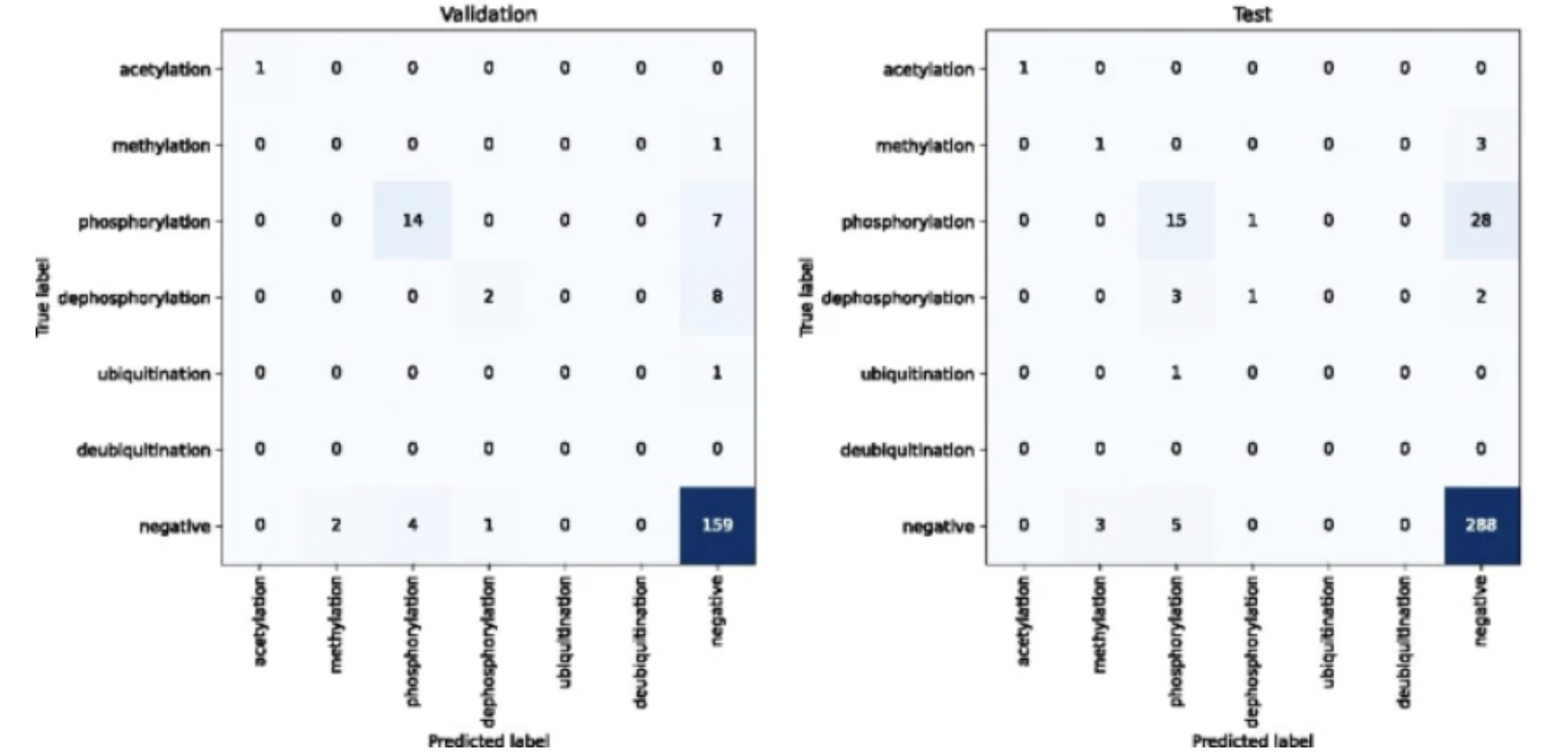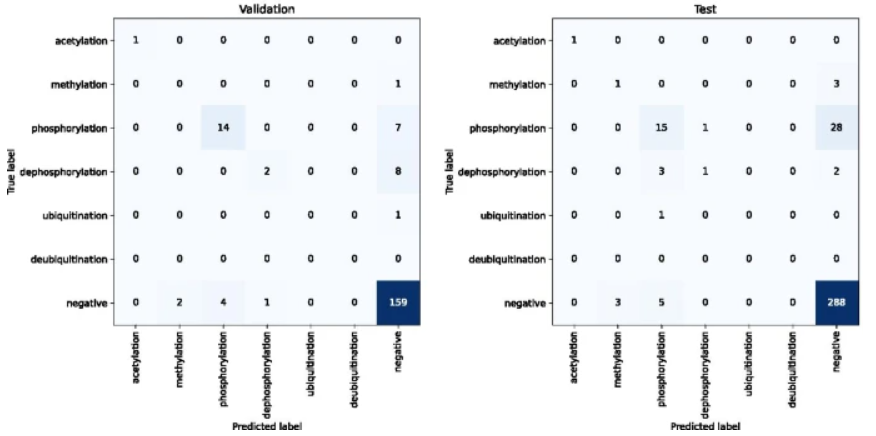 PPI-BioBERT-x10 上测试和验证集的混淆矩阵。