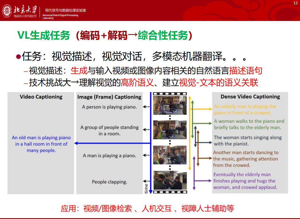 VL生成任务的技术难点在于需要理解视觉的高阶语义,建立视觉-文本的语义关联。例如,视频描述(Video Captioning)任务需要“概括”视频内容,图像描述(Image Captioning)任务需要对每一帧图像生成描述。