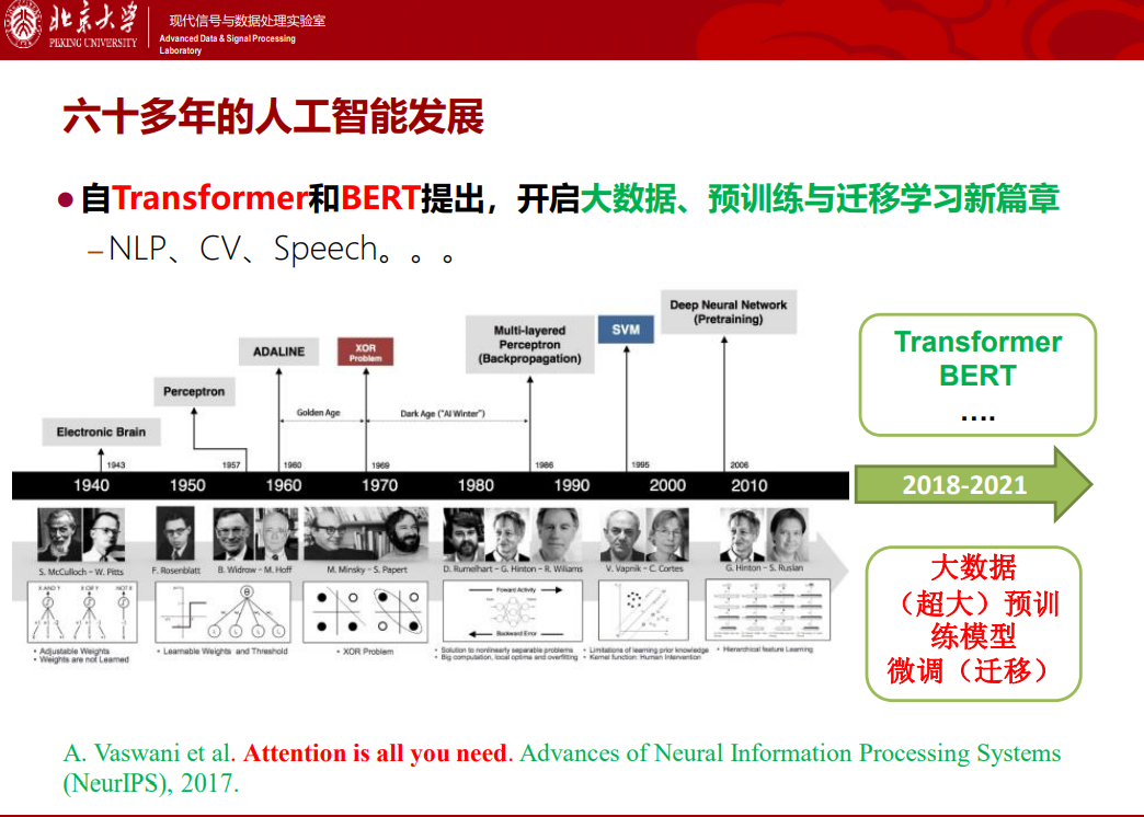 人工智能已经有六十多年的发展历程,自2017年以来,Transformer和BERT(2018年)相继提出,开启了大数据、预训练与迁移学习新篇章,将其定义为新时代也毫不夸张。目前,不同于前几十年的工作已成定论,该领域尚待进一步深入探索。