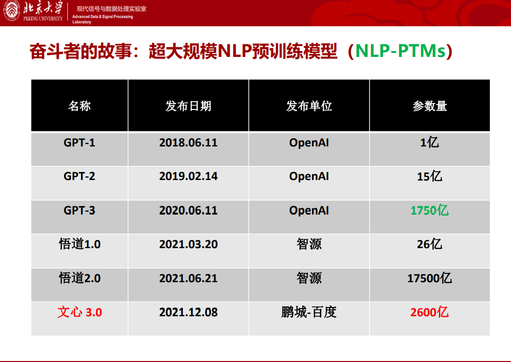以自然语言处理(NLP)为例,其演化过程如上图所示,OpenAI在2018年发布第一代GPT模型,短短几年时间“大模型”已经初具规模。这里的“大”有两层含义:模型训练使用的数据量大,模型蕴含的参数规模大。中国在这方面也有出色的工作,2021年的悟道2.0更是达到了万亿参数规模。