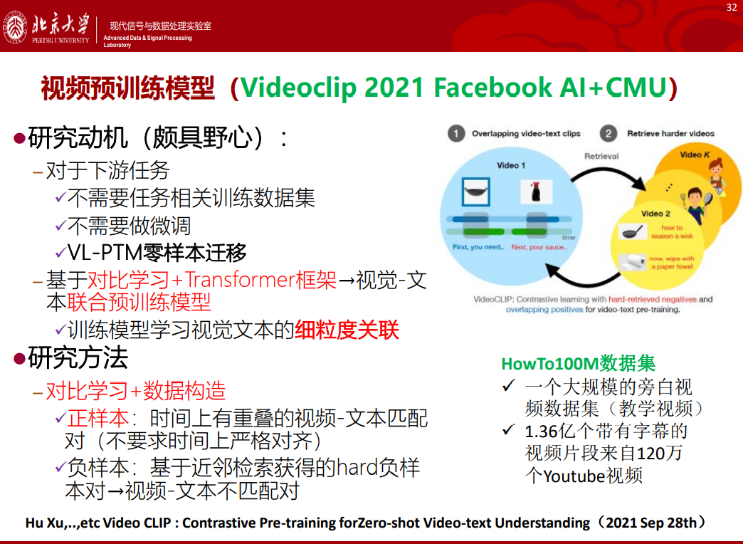 2021年10月份,Facebook发布了Video CLIP相关工作,属于视频VL预训练模型。从这个模型可以看出,Video CLIP颇具野心,期待对于下游任务不需要任务相关训练数据集,不需要进行微调,直接基于Video CLIP进行零样本迁移。
