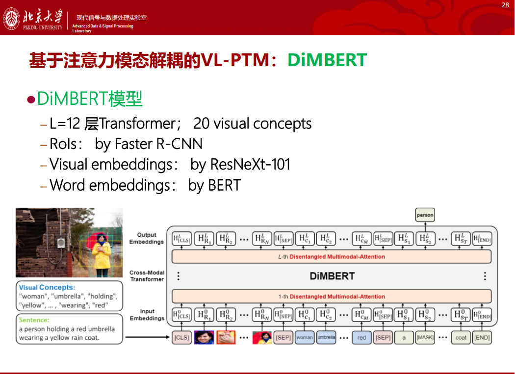 同时,引入视觉概念信息,缓解视觉语义鸿沟。经过验证发现,我们提出的基于注意力模态解耦的VL-PTM: DIMBERT(2020),可以同时适用于分类任务和生成任务。