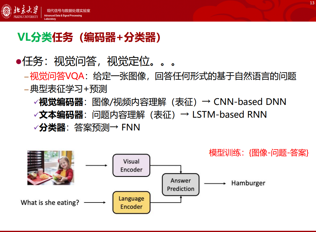 如上(左)图所示,如果你询问机器“What is she eating?”,VL分类器就会理解图片信息,然后给出正确的回答“hamburger”。