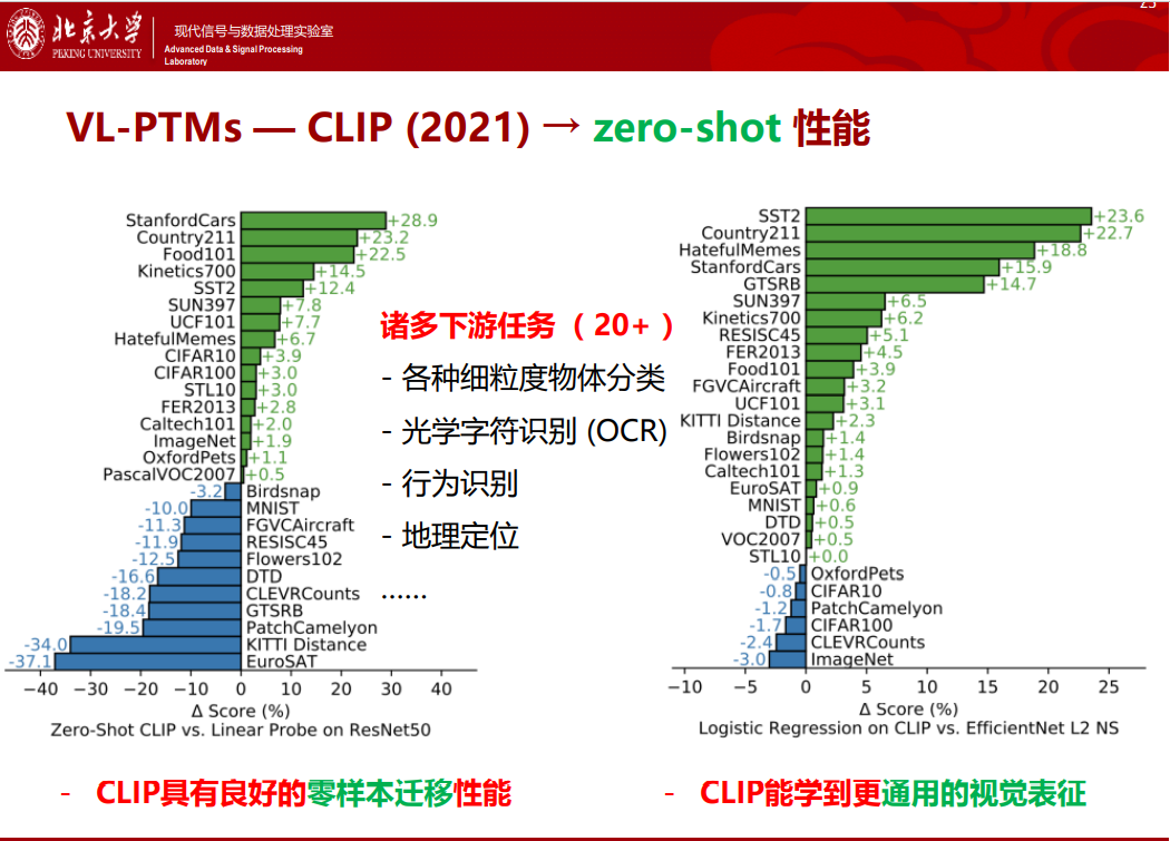 2021年OpenAI用双流框架开发了CLIP,CLIP的出现就技惊四座。其原理非常简单,分为编码和解码两个部分,编码器选用典型的Transformer。CLIP模型的惊艳之处在于,CLIP预训练模型直接能够拥有零样本学习(Zero-Shot Learning)能力, OpenAI在20多个不同粒度的分类任务中测试发现,CLIP预训练模型具有良好的零样本迁移性能,能学到更通用的视觉表征。