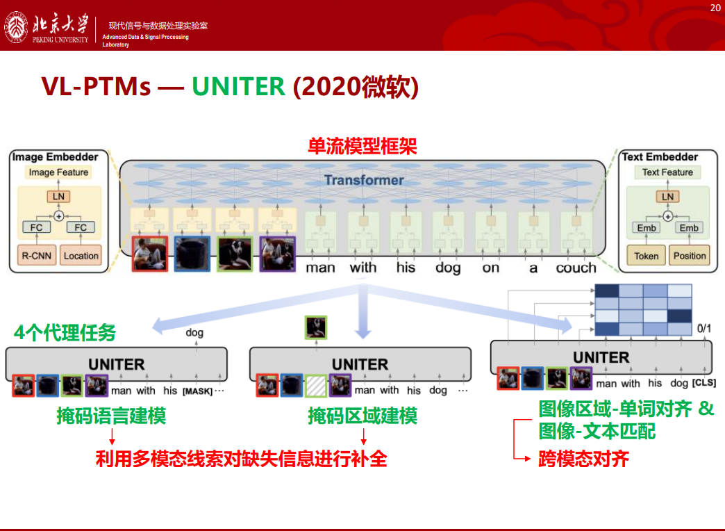 UNITER是2020年由微软提出的,它用了4个代理任务训练模型,在4个下游任务进行了测试,获得了性能提升。上述研究都是采用预训练模型加 “微调”的研究范式。