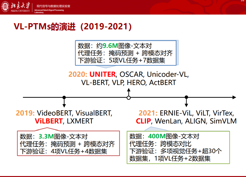 因此,探索新的VL预训练代理任务,减少对数标注的依赖,是一个很有意义的研究方向。2019年学术界开启了VL-PTMs的研究工作。