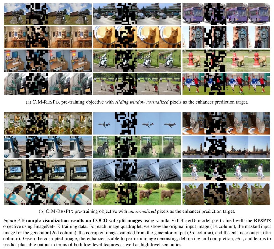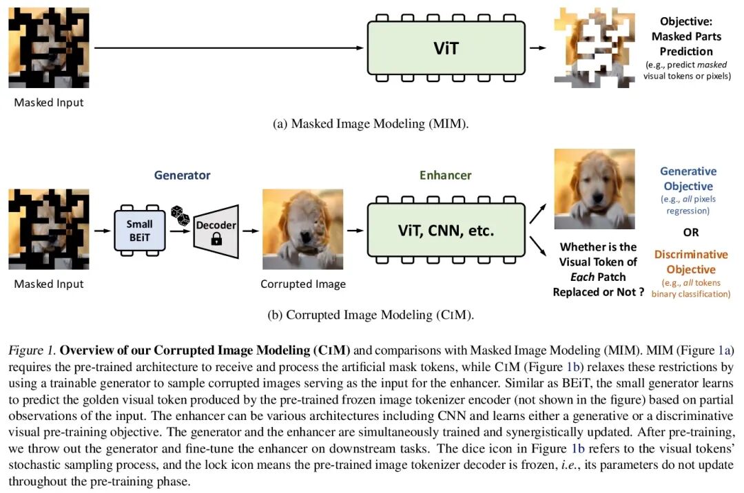 面向自监督视觉预训练的破坏图像建模。本文提出面向自监督视觉预训练的破坏图像建模(CIM)。CIM用一个具有小型可训练BEiT的辅助生成器来破坏输入图像,而不是用人工掩码token,其中一些图块是随机选择的,并用从BEiT输出分布中抽样的合理的替代内容进行替换。对于该被破坏图像,一个增强器网络学习恢复所有原始图像像素,或预测每个视觉token是否被生成器样本所取代。生成器和增强器同时被训练并协同更新。经过预训练后,增强器可以作为一个大容量的视觉编码器用于下游任务。CIM是一个通用且灵活的视觉预训练框架,适用于各种网络架构。CIM首次证明了ViT和CNN都可以使用一个统一的、非Siamese的框架学习丰富的视觉表示。该方法在视觉基准上取得了引人注目的结果,如ImageNet分类和ADE20K语义分割,在ImageNet-1K图像分类中,300个epoch CIM预训练的vanilla ViT-Base/16和ResNet-50分别获得83.3和80.6的Top-1微调精度。