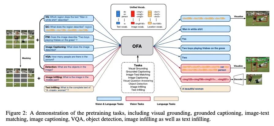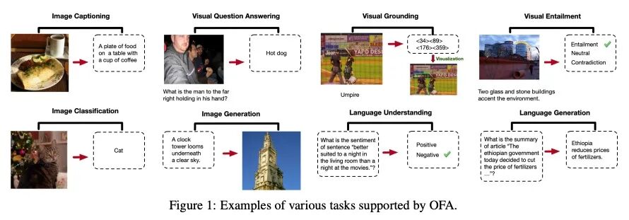 统一架构、任务和模态的简单序列到序列学习框架。本文研究统一的多模态预训练范式,以打破复杂任务/特定模态定制的框架。提出OFA,一个统一的多模态预训练模型,将模态(即跨模态、视觉、语言)和任务(如图像生成、图像描述、图像分类、文本生成等)统一到一个基于编码器-解码器架构的简单序列-序列学习框架,用任务指令进行预训练和微调,不引入额外的特定任务层进行微调。实验结果表明,OFA在一系列多模态任务上达到了新的水平。通过广泛分析证明OFA在单模态任务中达到了与单模态预训练模型(如BERT、MAE、MoCo v3、SimCLR v2等)相当的性能,包括NLU、NLG和图像分类,并且可以有效地迁移到未见的任务和领域。