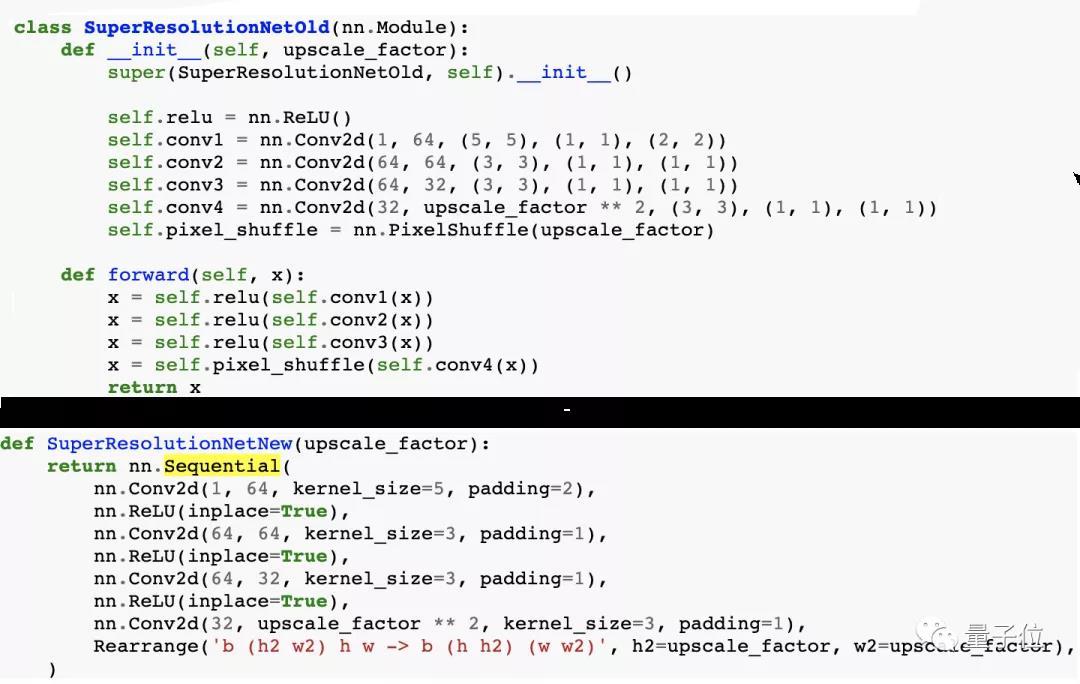 可以看到,结合了Einops之后的代码不需要特殊指令PixelShuffle,并且,还使用了模块调用nn.ReLU以及nn.Sequential。