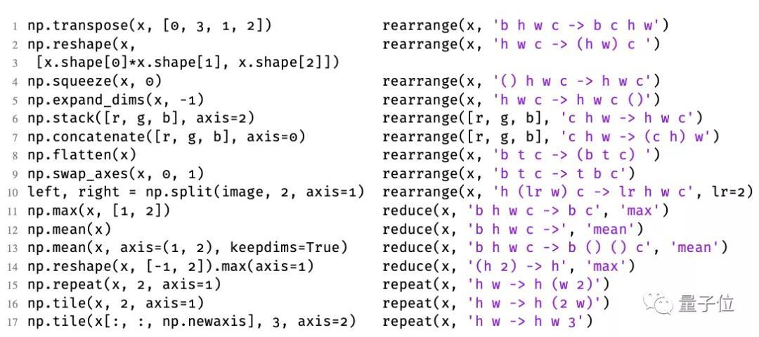 在这些特征中,输入和输出被描述为张量的维度和坐标的预期顺序,这使得基于Einops的代码的可读性和易修改性非常高,用户也不需要在每次操作后记住或推断出张量的形状。